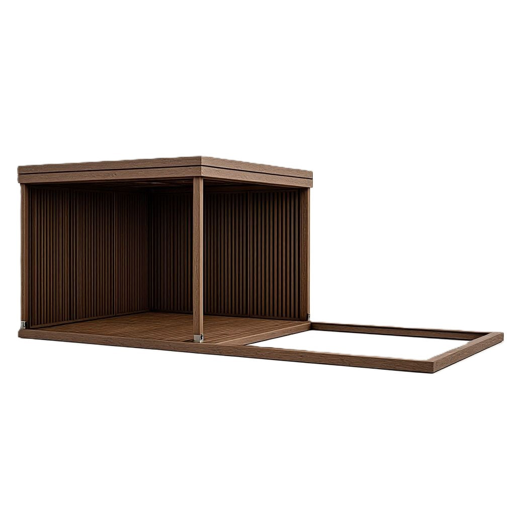 Varjualuse seinad koosnevad kuuest püstise kahepoolse 18x42 mm termopuidust laudisega seinamoodulist. Seinamooduli laius 1 m, kõrgus 2.1 m. Laudis on õhuline ja otsevaates ei ole läbinähtav.