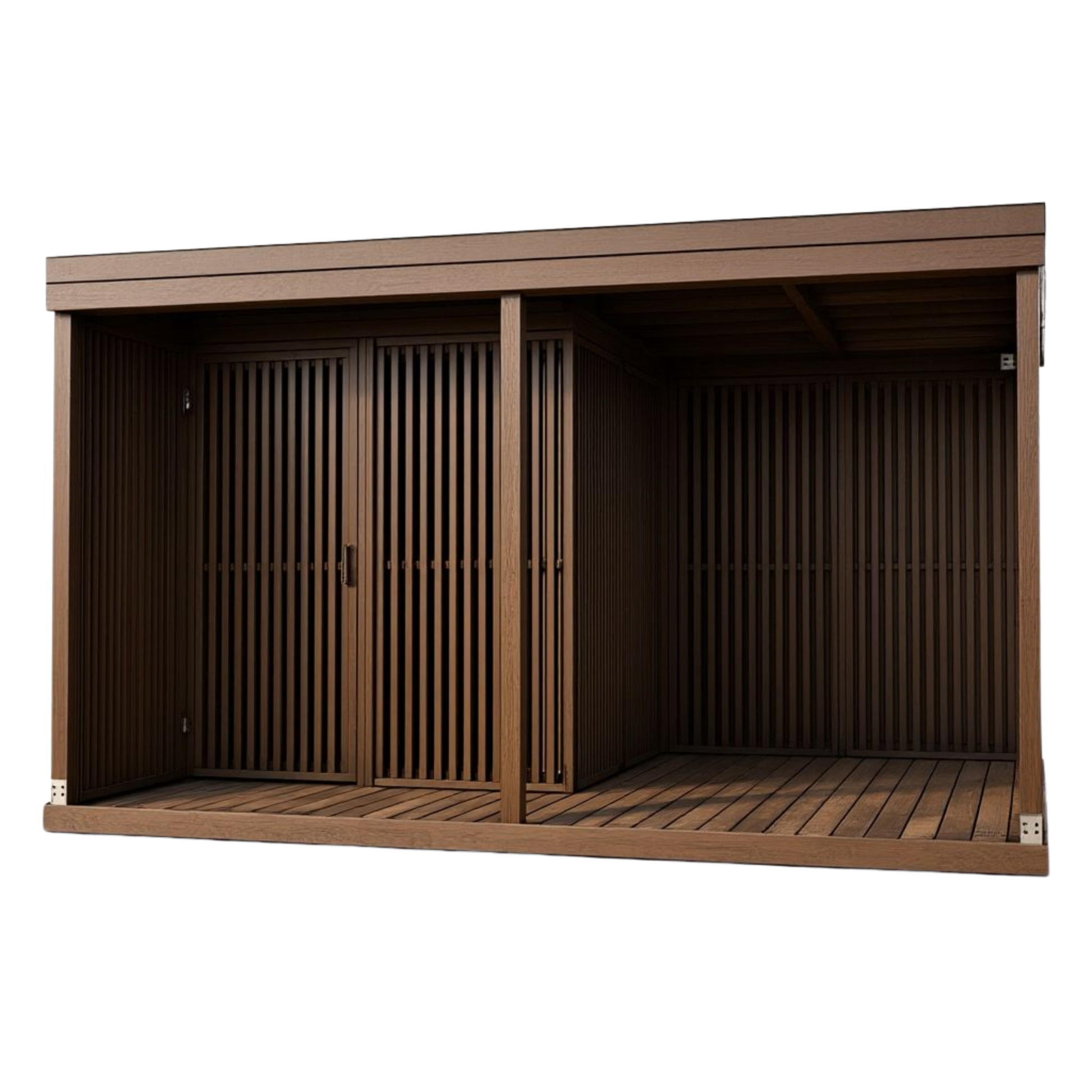 Varjualuse seinad koosnevad kümnest 1x2,1 m püstise kahepoolse 18x42 mm termopuidust laudisega seinamoodulist ja ühest uksemoodulist. Laudis on õhuline ja otsevaates ei ole läbinähtav.