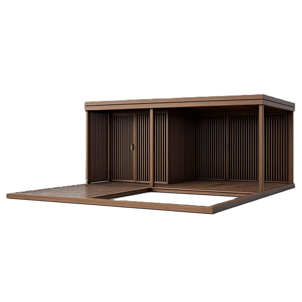 Varjualuse seinad koosnevad üheteistkümnest 1x2,1 m püstise kahepoolse 18x42 mm termopuidust laudisega seinamoodulist ja ühest uksemoodulist. Laudis on õhuline ja otsevaates ei ole läbinähtav.