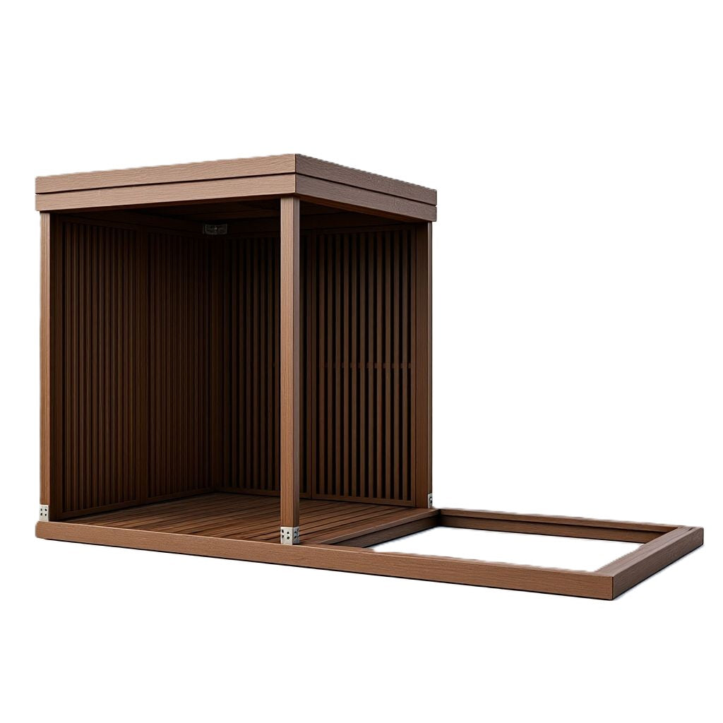 The sunroom walls are made from four upright, double-sided 18x42 mm thermowood board wall modules. Each wall module is 1 m wide and 2.1 m high. The boards are airy and not see-through in direct view.