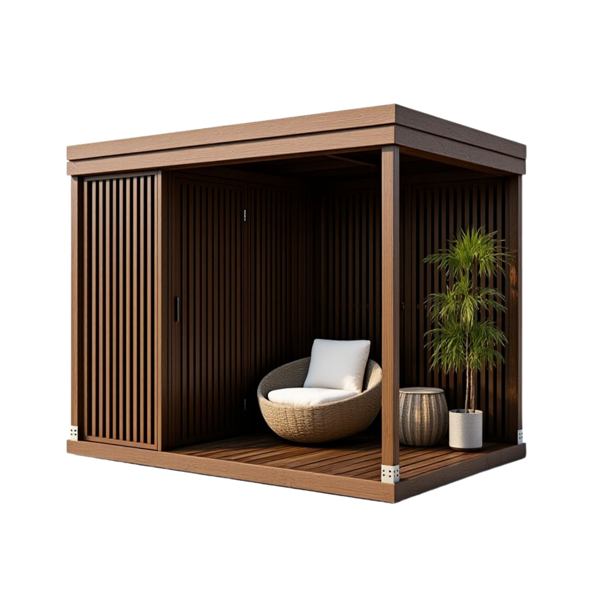Sunroom walls are made from seven upright, double-sided 18x42 mm thermowood board wall modules and one door module. Each wall module is 1 m wide and 2.1 m high. The boards are airy and not see-through in direct view.